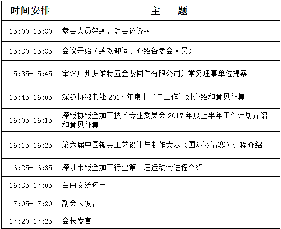 深圳市鈑金加工行業(yè)協(xié)會定于2017年02月25日(周六)下午15:30在任達(dá)電器召開三屆一次常務(wù)理事會,討論協(xié)會2017年上半年工作及各項(xiàng)目計(jì)劃安排。